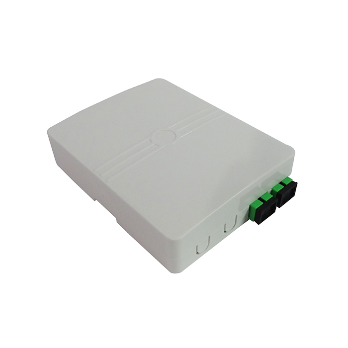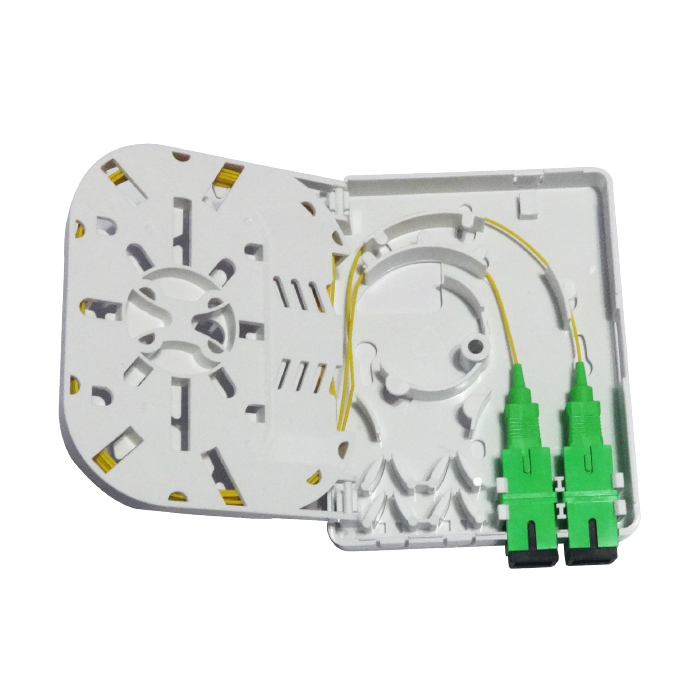 Esta salida FTTH está diseñada para adaptadores SC/APC. La tapa está asegurada a través de un diseño de autosujeción, y un compartimento de almacenamiento de fibra y un empalme termorretráctil integrado y un soporte de empalme mecánico están presentado en el interior.