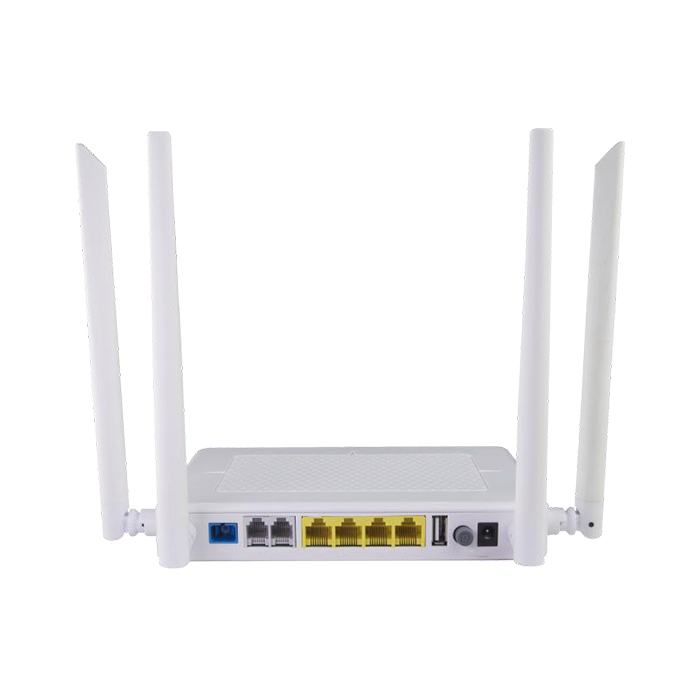 Puerto óptico: SC/APC Puertos: 4GE Soporta: GPON Antenas: 5 dbi Wi-Fi: 2.4 GHz y 5 GHz (hasta 1.2 Gbps) Monitorización, OMCI.