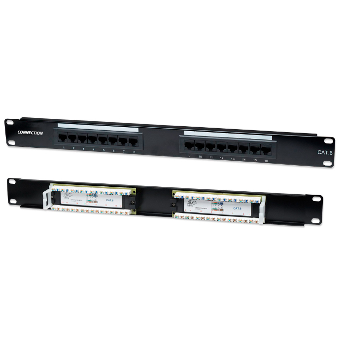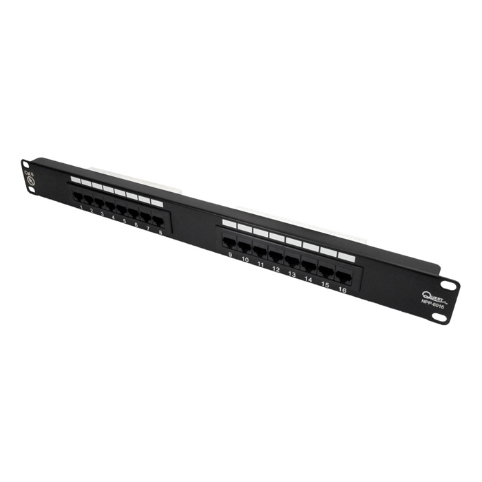 Patch Panel de 16 puertos categoría 5E marca QUEST. Construido con jacks RJ-45 categoría 5E. Montable en rack. Terminación 110 IDC para los jacks.